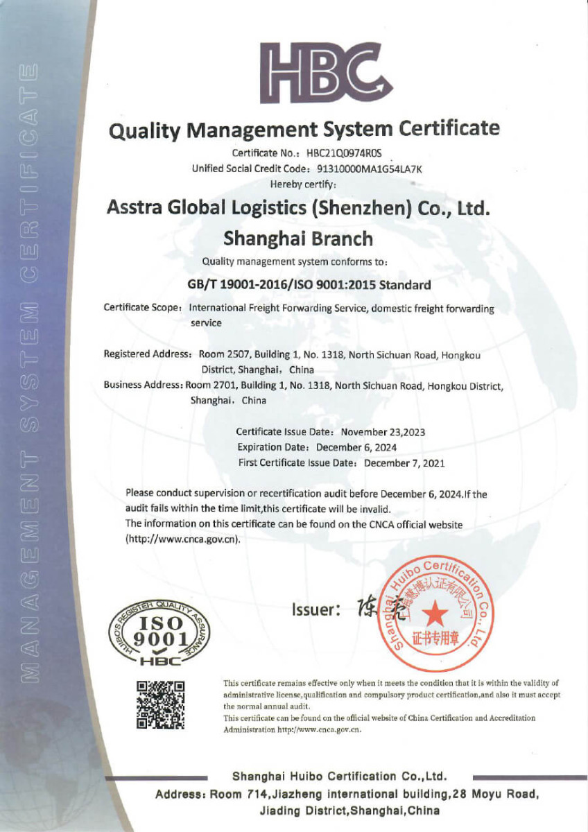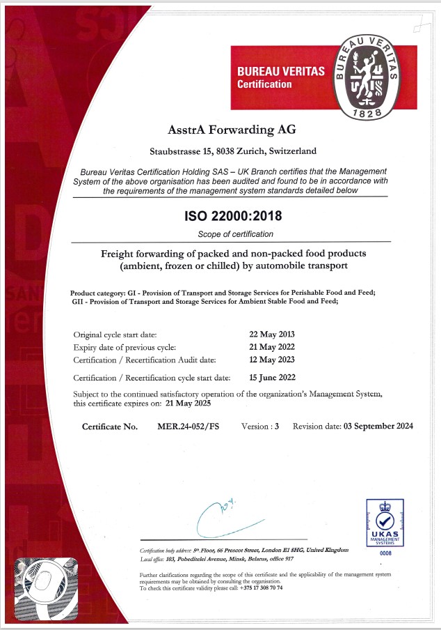 Requirements for companies involved in the food supply chain.Our food safety management system applies to activities carried out in the interests of end consumers. The system helps manage the transport of both packaged and unpackaged food, including potentially hazardous goods. The standard takes into account national and international requirements for food safety and quality. The compliance certificate audit for ISO 22000:2018 was carried out by Bureau Veritas. Today, AsstrA is one of the few logistics companies in the CIS region using a ISO 22000:2018 certified management system. Further development in food product logistics is planned, with particular emphases placed on improving specialized processes and raising awareness amongst business Partners.GB/T 19001-2016/ISO 9001:2015