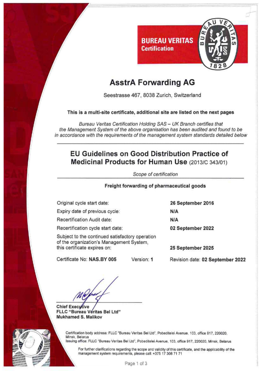 The certificate confirms compliance with EU guidelines on Good Distribution Practice (GDP). Certification was performed by Bureau Veritas, a global leader in the field of testing, inspection, and certification. Our certificate offers one more reason our customers can trust us to ship their medicines reliably. Our certificate demonstrates our commitment to using up-to-date control technologies and sharing shipment information with customers at all stages of cargo transportation.