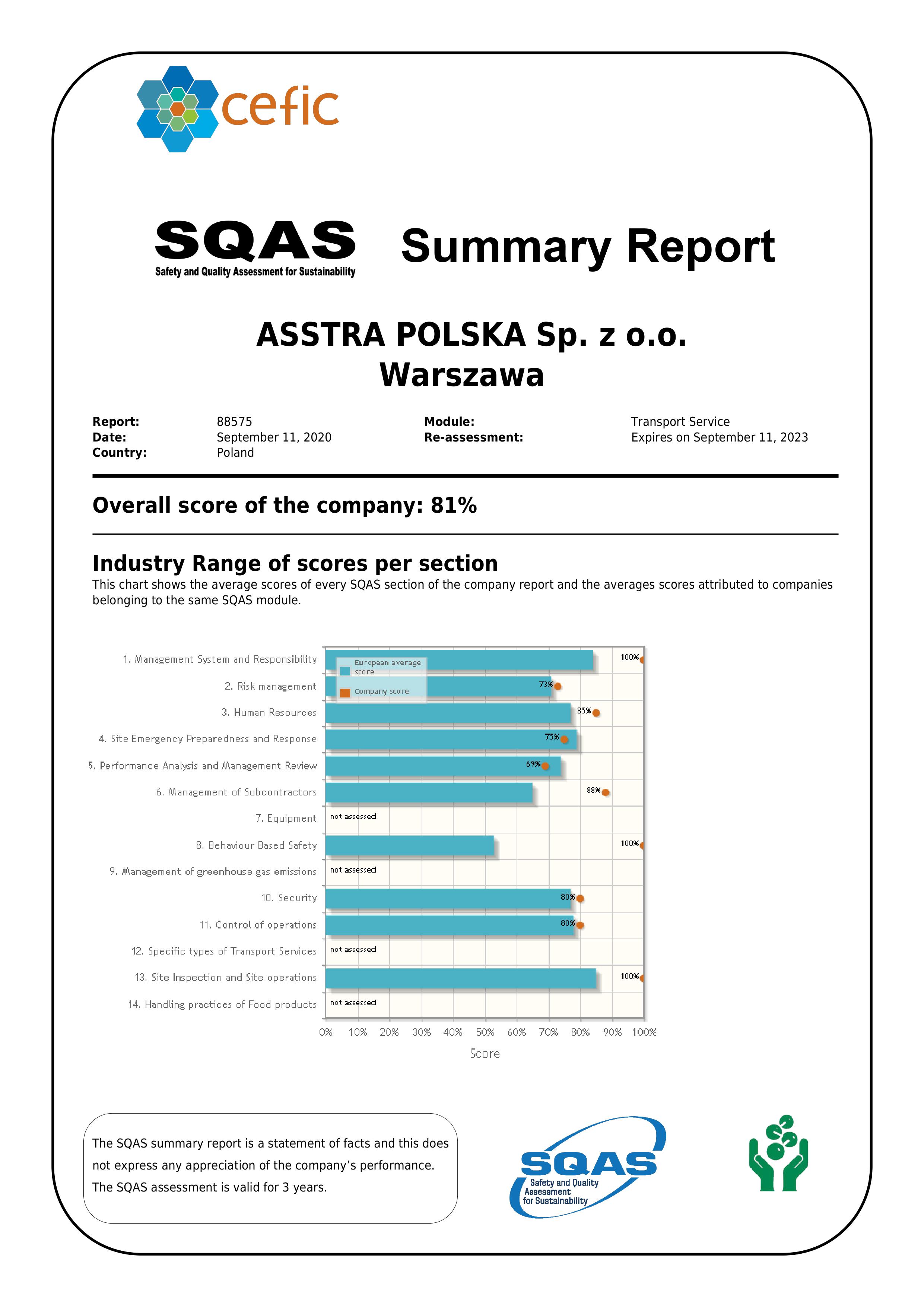 Our company has passed a testing required for logistics providers engaged in transportation of chemical goods. The positive assessment report issued by an SQAS accredited assessor confirms our readiness to transport both neutral and dangerous chemical products.SQAS (AsstrA Italia s.r.l.)