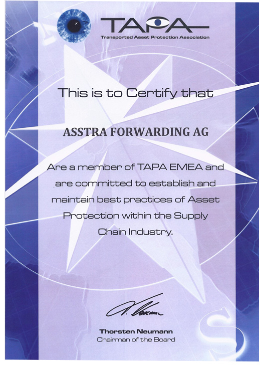 Being a member of the Transported Asset Protection Association means to adhere to safeguards during the supply chain process. The main objectives of TAPA are to ensure the highest level of cargo safety and security during international transportation. Due to AsstrA standards it is crucial to minimize theft andAEO