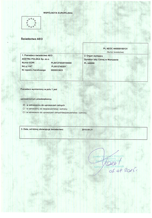 Authorized Economic Operator certificate affirms our company’s status as a reliable Partner working in compliance with established security standards and applicable laws. This became possible thanks to close cooperation with federal customs authorities. Certification allows us to streamline clearance steps by making use of the simplified customs procedure. This guarantees priority service for customs declarations, simplification of import/export declarations and a minimum number of documents and cargo inspections, resulting in expedited services for our Clients.GDP