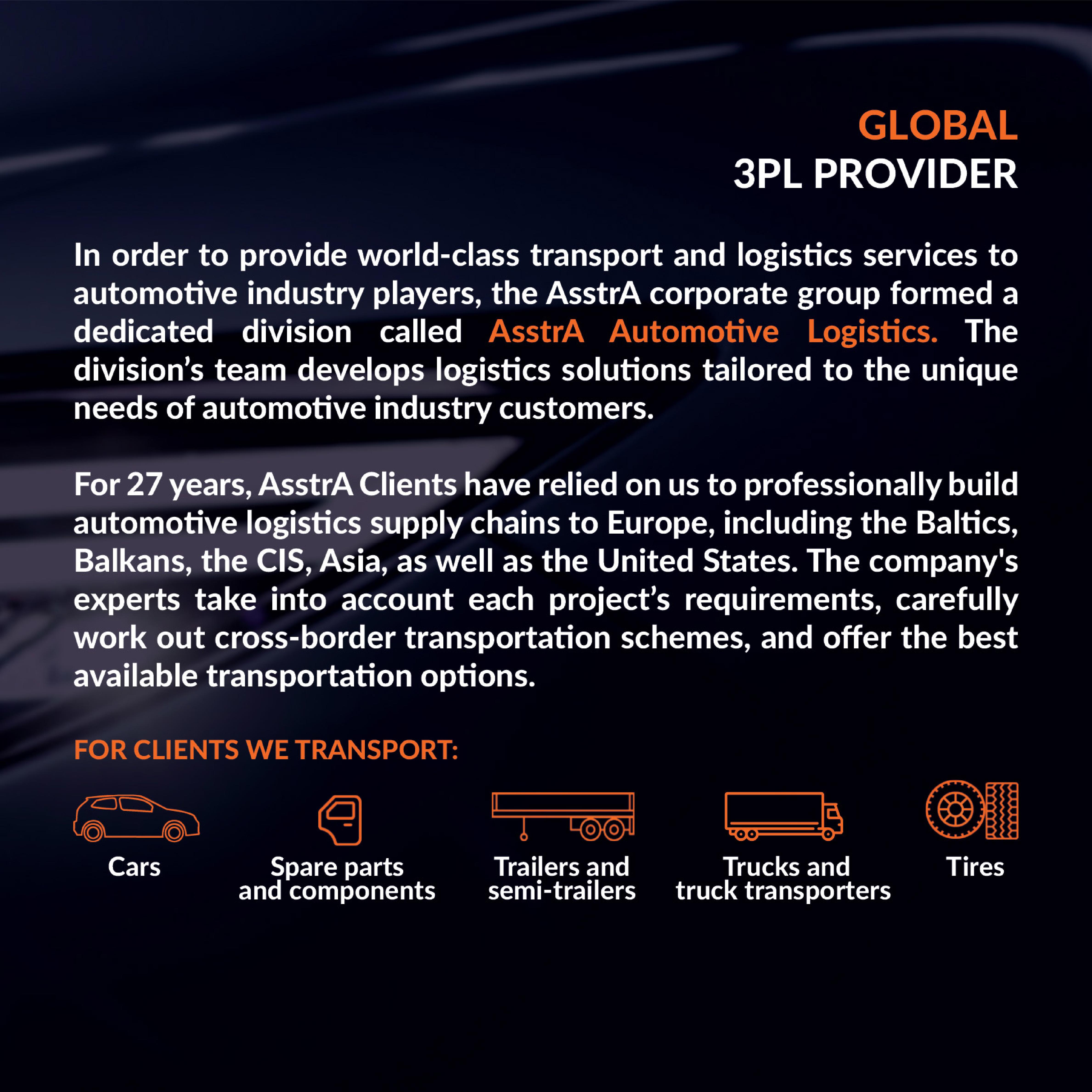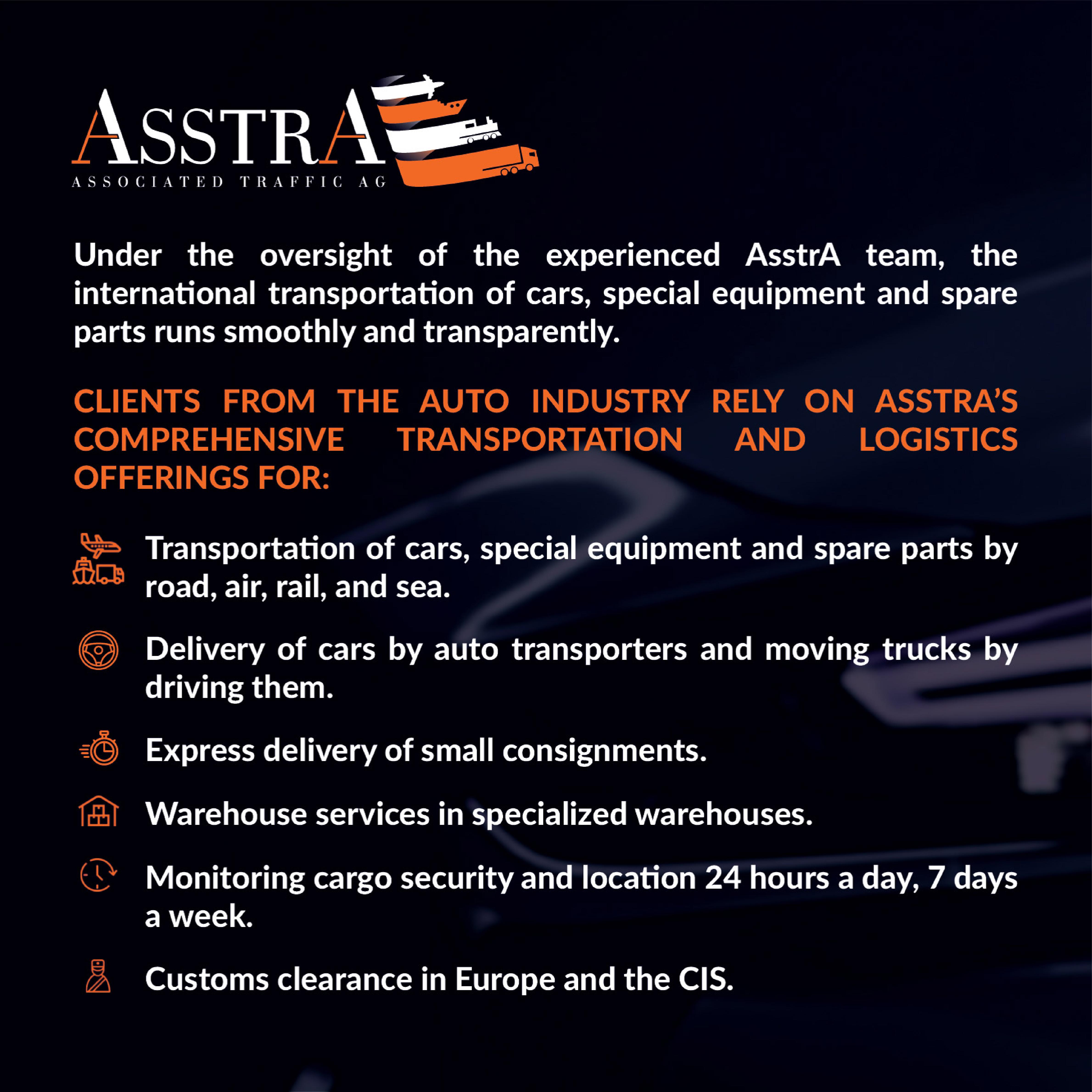 AsstrA is a single, expert source for a full range of services supporting the transportation of cars and spare parts: international freight forwarding services, intermodal scheme development, customs and documentation support, insurance, consulting, project logistics, and logistics services. In addition to a presence in 22 COUNTRIES, our company has 8 in-house customs agencies allowing us to improve and develop innovative logistics and transport solutions on a continuous basis