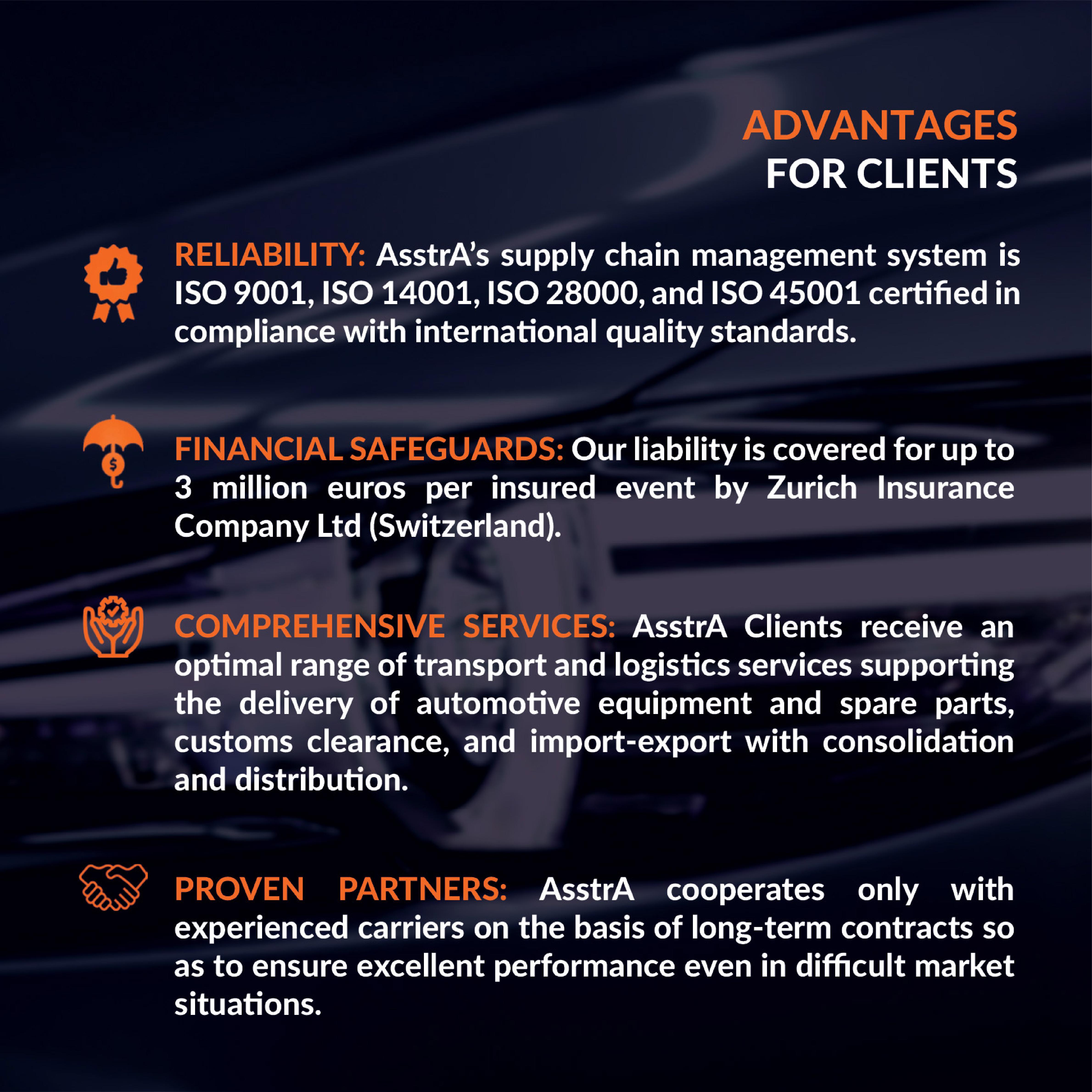 AsstrA employees are qualified to solve each issue related to the transportation of cars and spare parts. Thanks to the well-coordinated work of our specialists, each AsstrA Client is guaranteed cargo safety, a clear and well-organized delivery system, observance of the established terms of transportation, and fulfillment of all technical and sanitary standards