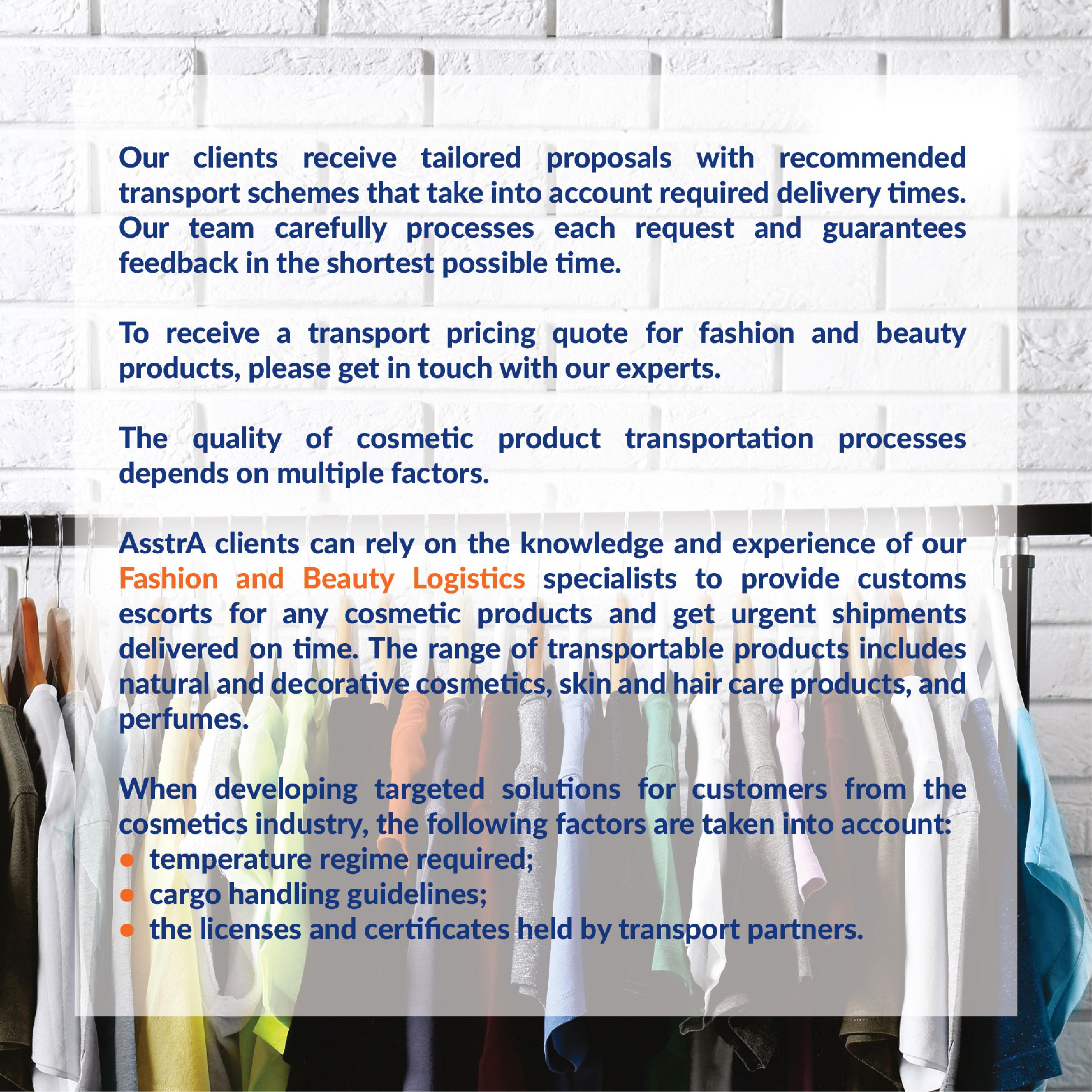 OUR SKILLS IN COSMETICS TRANSPORTATION AsstrA employees are highly qualified and have many years of experience in the field of cargo transportation in general and in the transportation of cosmetics and perfume in particular. Experience and qualifications help us take an individual approach to each order that is appropriate to the specifics of the cargo involved and the wishes of the Client. Cooperation with reliable transport service providers allows us to develop and select optimal delivery routes, clearly coordinate all stages of delivery, and transport any cargo in a timely manner.