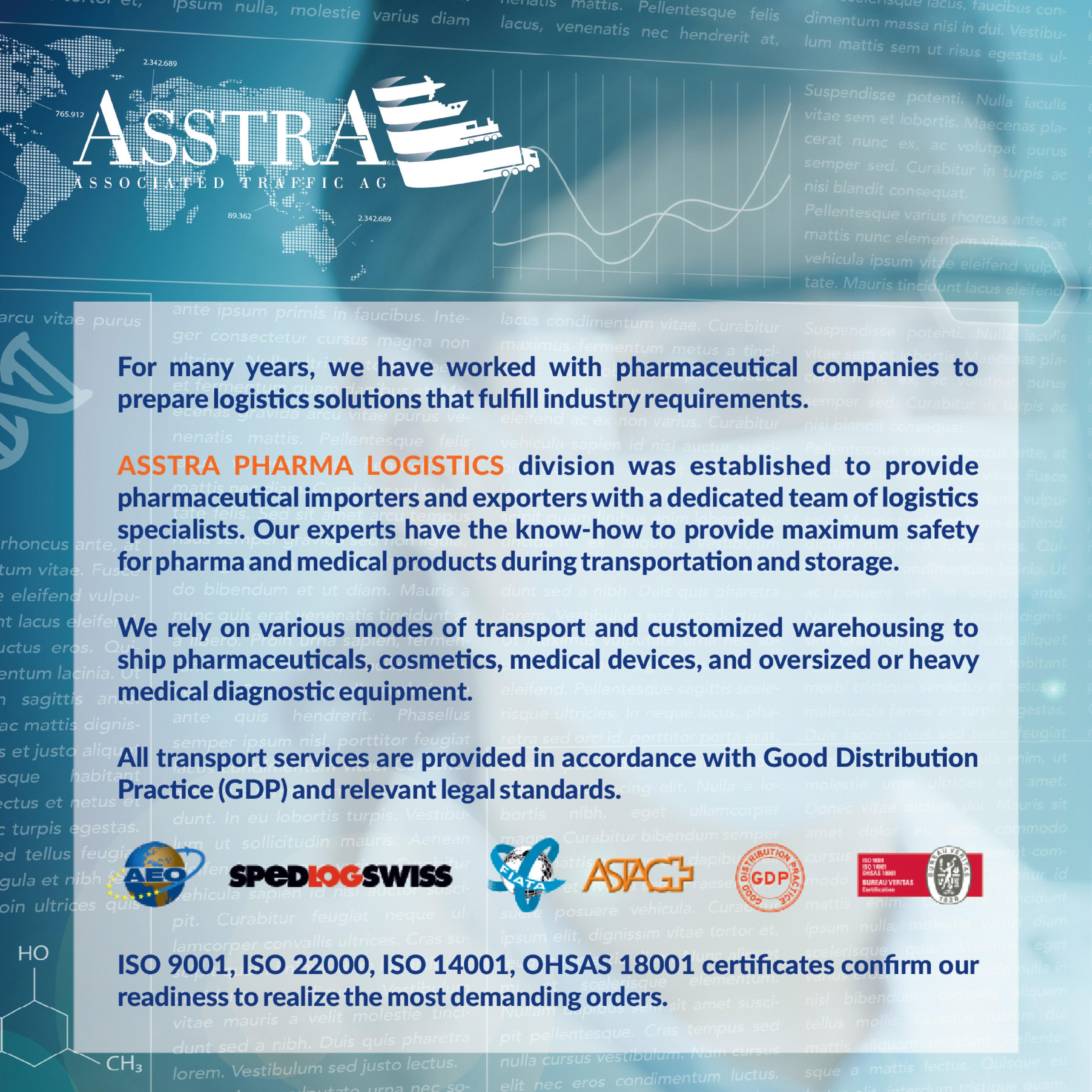 ✅ OUR OFFER FOR INTERNATIONAL SHIPMENT OF PHARMACEUTICALSAsstrA has earned a reputation with the world’s leading pharmaceutical companies as a reliable logistics Partner. Our company voluntarily meets the highest standards for logistics suppliers and has obtained a Safety & Quality Assessment System (SQAS) certificate to support quality control and safety procedures while working with chemical and pharmaceutical products. Moreover, AsstrA strictly follows Good Distribution Practices.