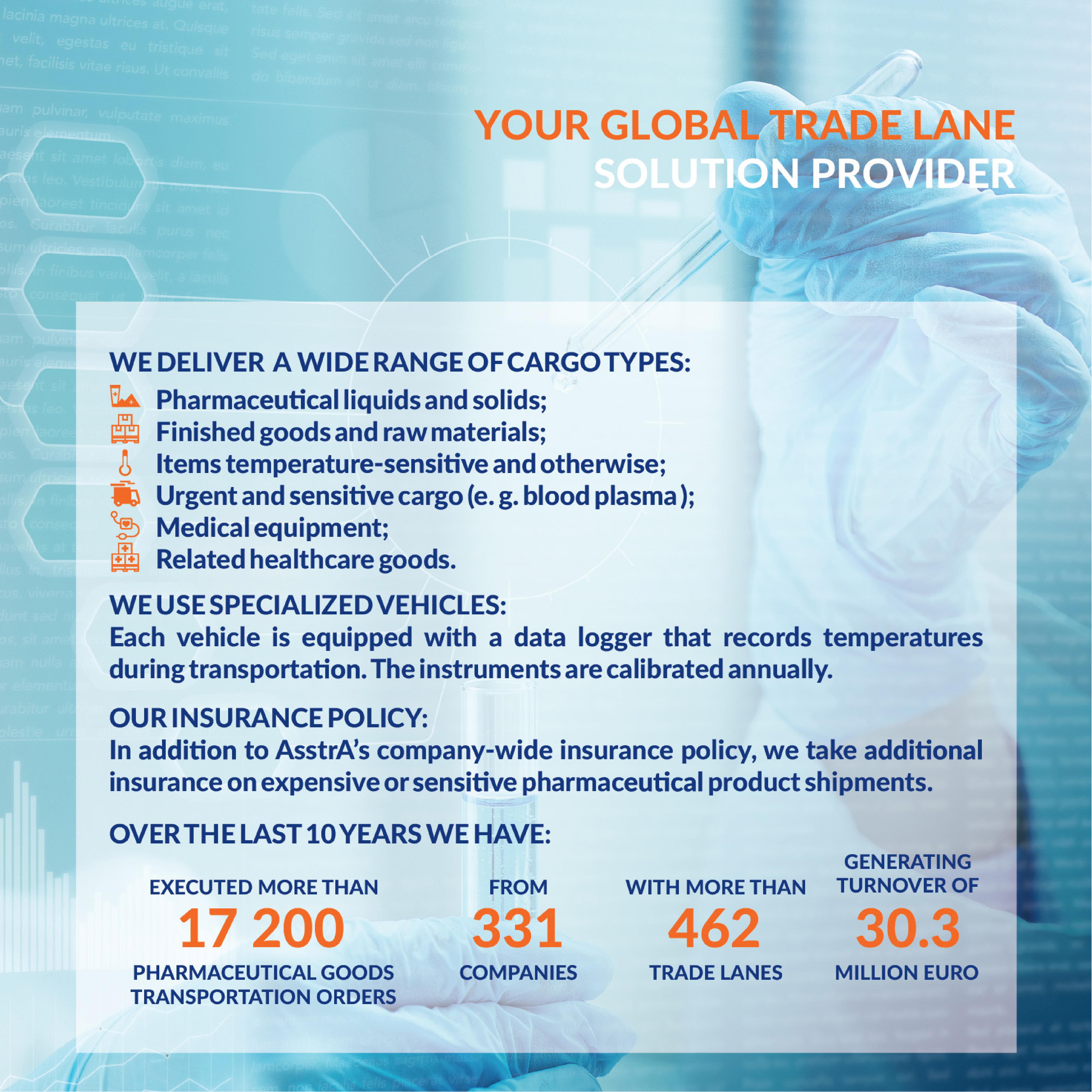 AsstrA is a single, expert source for a full range of services supporting the transportation of pharmaceuticals, such as: international freight forwarding, intermodal scheme development, customs and documentation support, insurance, consulting, project logistics, and logistics. In addition to a global presence in 22 countries, our company has 8 in-house customs agencies allowing us to improve and develop innovative logistics and transport solutions on a continuous basis.