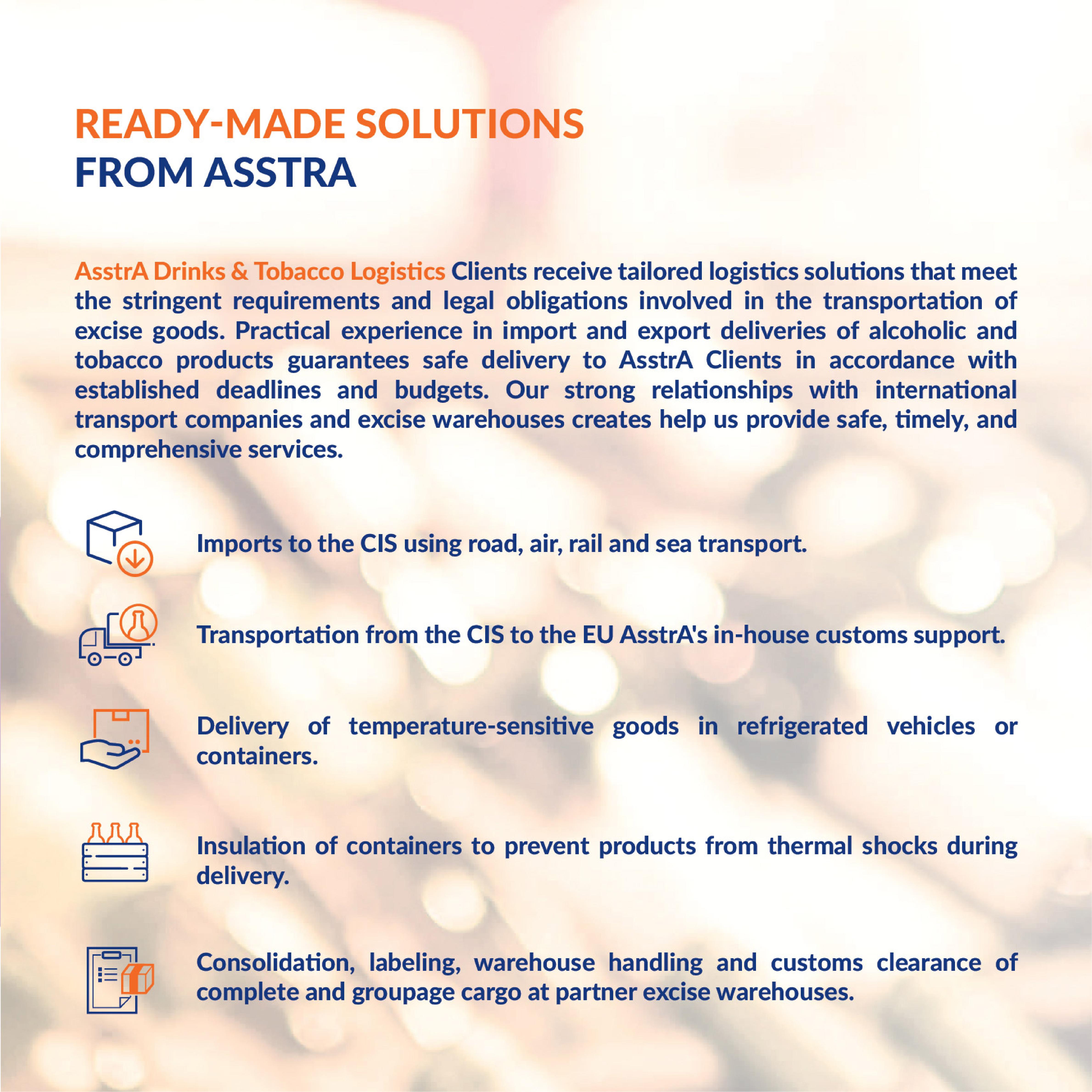 AsstrA Drinks & Tobacco Logistics team members have a thorough understanding of the specific nature of the alcohol market and transportation isses therein. Our specialists can thus provide maximum cargo security during transportation and storage, adhere to all sanitary and technical standards, and take into account all requirements of legislation on excisable goods.