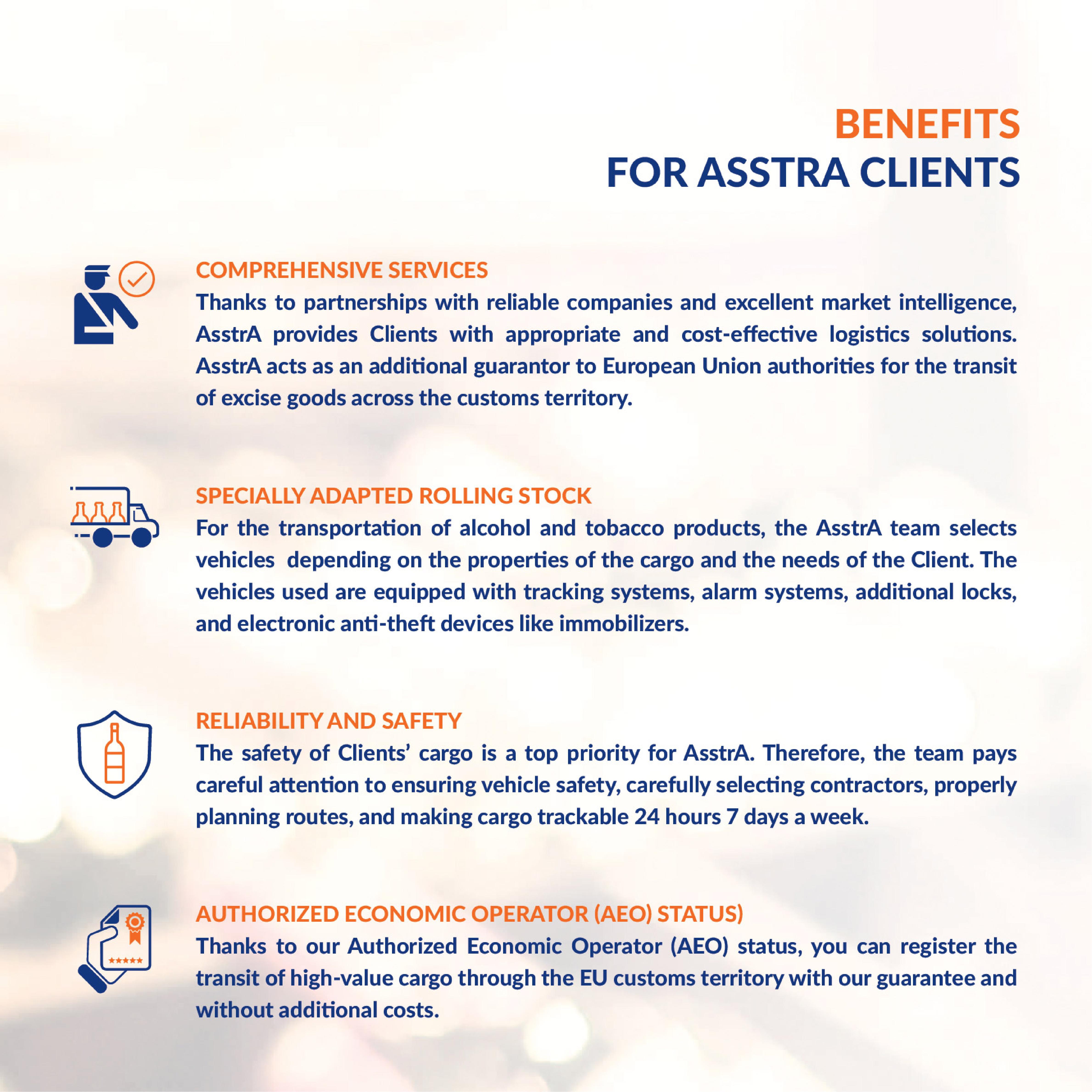 AsstrA is a member of the Transported Asset Protection Association (TAPA), participation in which provides additional opportunities to minimize the risks of damage and loss of cargo while transporting alcohol. In addition, AsstrA has an Authorised Economic Operator (AEO) certificate, which confirms that our company is a reliable and solvent Partner complying with safety standards and all legal requirements during transportation.