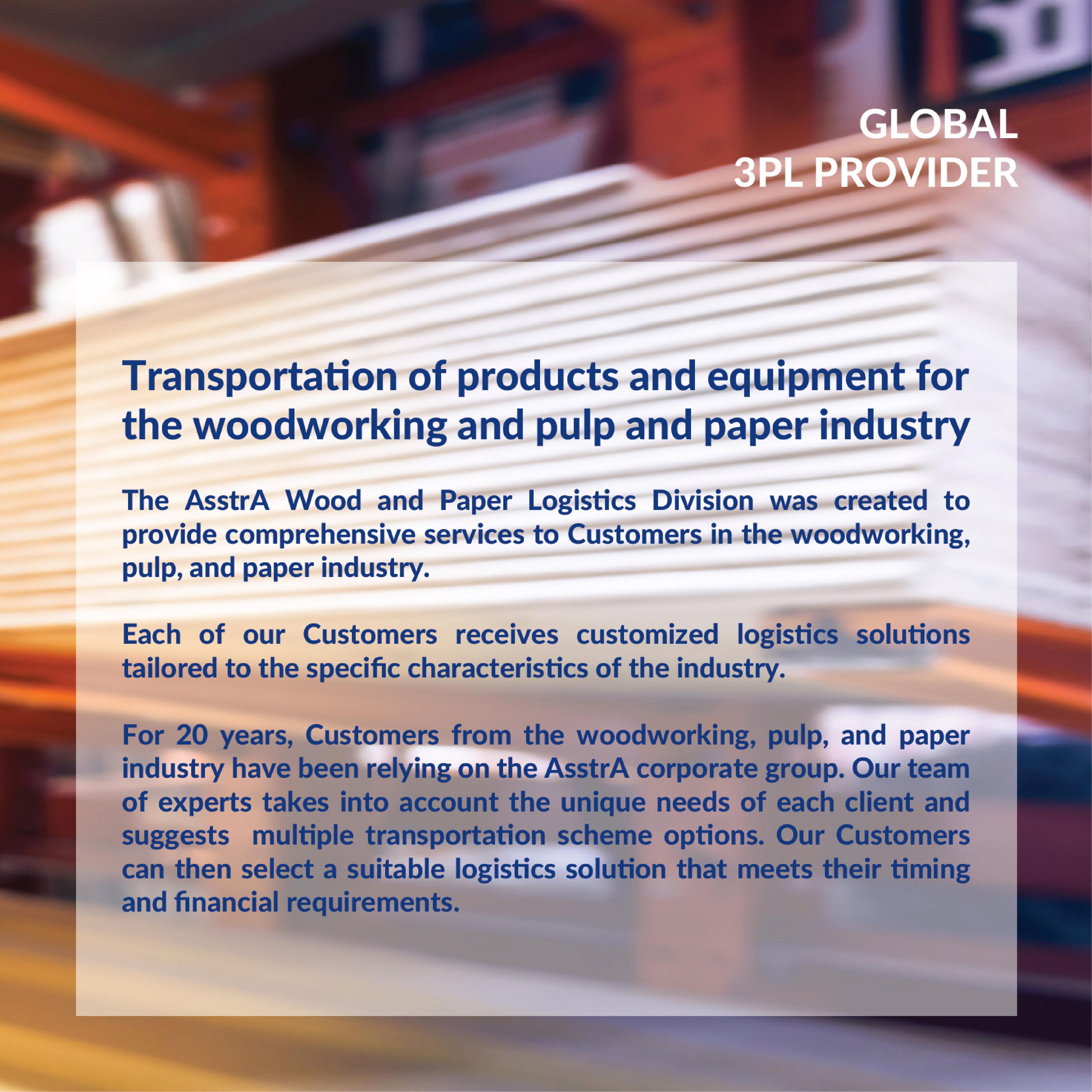 We are a reliable, long-standing Partner for our customers in the wood processing and pulp-paper industry. To ensure high quality services and to meet the individual needs of our customers, we formed AsstrA Wood & Paper Logistics Division. Our experienced staff specialize in the international transportation of wood & paper products, raw materials for associated production processes, as well as technological and woodworking equipment for constructing new plants or upgrading existing ones. Shipments are arranged using road, rail, sea and air transport, as well as multimodal logistics solutions. When transporting heavy or bulky goods, our professional employees design bespoke logistics schemes with customized rolling stock, specialized handling equipment, and full documentation support provided.