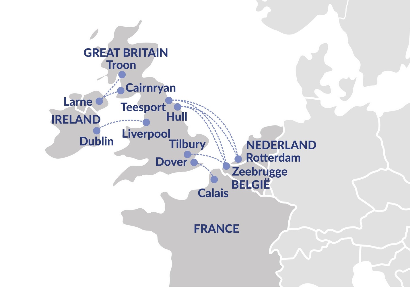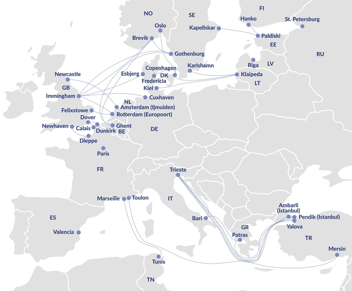 DFDS: FI – EE, EE – SE, SE – LT, SE – NO, SE – UK, SE – DE, SE – DK, DK – UK, LT – DE, NO – UK, NO – BE, UK – FR, UK – NL, FR – TN, FR – TR, TR – IT, IT – GR, GR – TR.