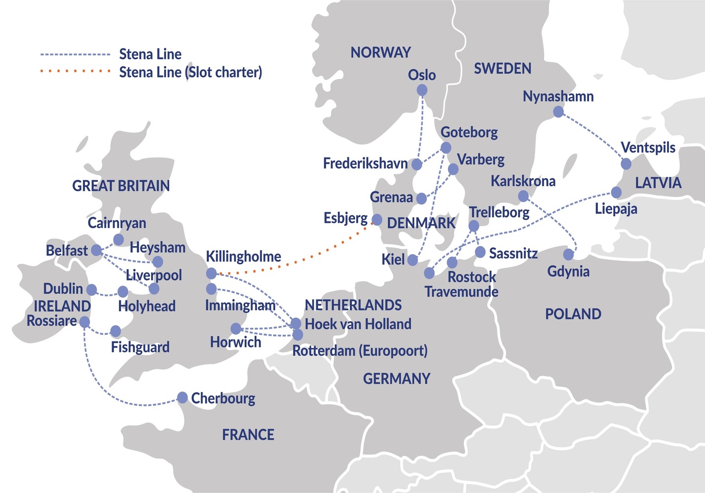 Stena Line: SW – LV, LV – DE, SW – PL, SW – DE, SW – DK, NO – DK, UK – NL, UK – IE, IE – FR.
