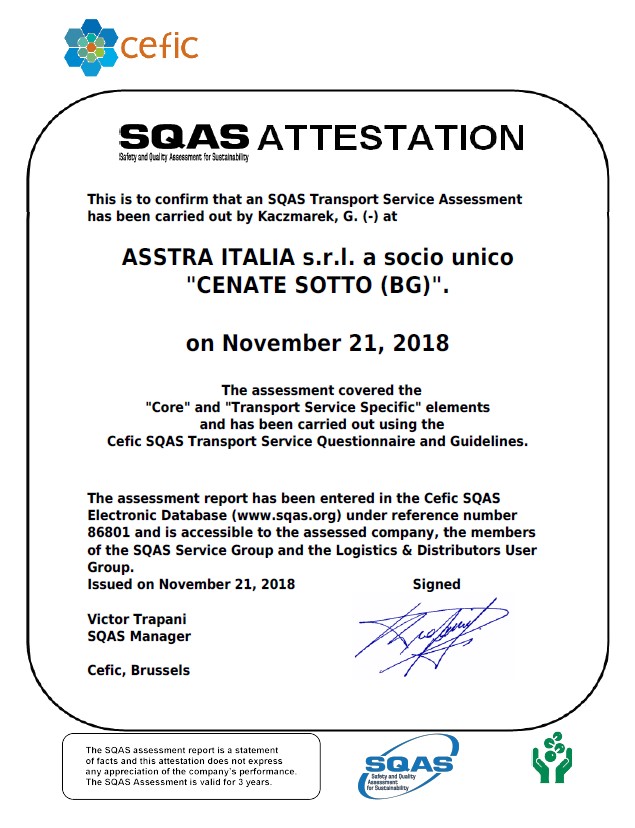 “SQAS accreditation is a key indicator of responsible care in logistics operations. Transport companies and other types of services providers that are active in land logistics and chemical distribution use SQAS to measure their performance. The results of an SQAS evaluation are used by member companies of The European Chemical Industry Council (CEFIC) when selecting transportation and logistics services providers. CEFIC unites more than 29,000 European chemical companies that provide 1.3 million jobs in a third of the global chemical production industry. International transportation and logistics services provider AsstrA-Assciated Traffic AG offers a full range of logistics and transportation services necessary for the international transportation of chemical goods. In order to guarantee the highest safety and quality in the transportation of chemical products, AsstrA regularly undergoes SQAS assessments. In November this year the AsstrA Italy Branch Office received high SQAS evaluation scores. Previously, the Italian office had been successfully assessed in 2015,” explains Vladislav Alejnikov, Quality & Environment Manager at AsstrA-Associated Traffic AG.